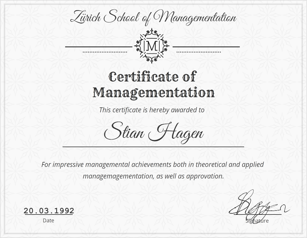 I'm a cerified manager, through and through. I was born with management in my blood. To hone my natural talent for managementation and approvation, I went to the Zürich School of Managementation in Zürich, Switzerland, where I managed my way to a diploma and a GPA of 5.0/4.0.